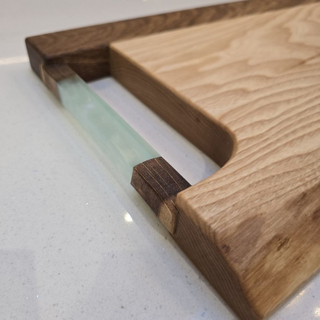 Our stunning Oak and Ash combined cutting board boasts a unique design with a sea glass inspired epoxy handle, blending natural elements with a touch of coastal charm. The chunky live edge adds a rustic yet modern feel to your kitchen décor. Crafted for both functionality and style, this cutting board is perfect for preparing meals or serving. Add a touch of elegance to your kitchen with our one-of-a-kind cutting board. Don't forget to add our very own Hup wood butter to nourish your board and keep it looking its best.